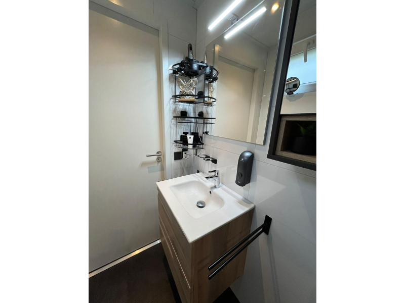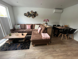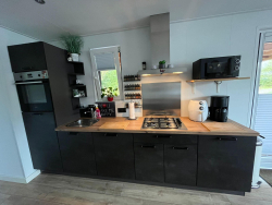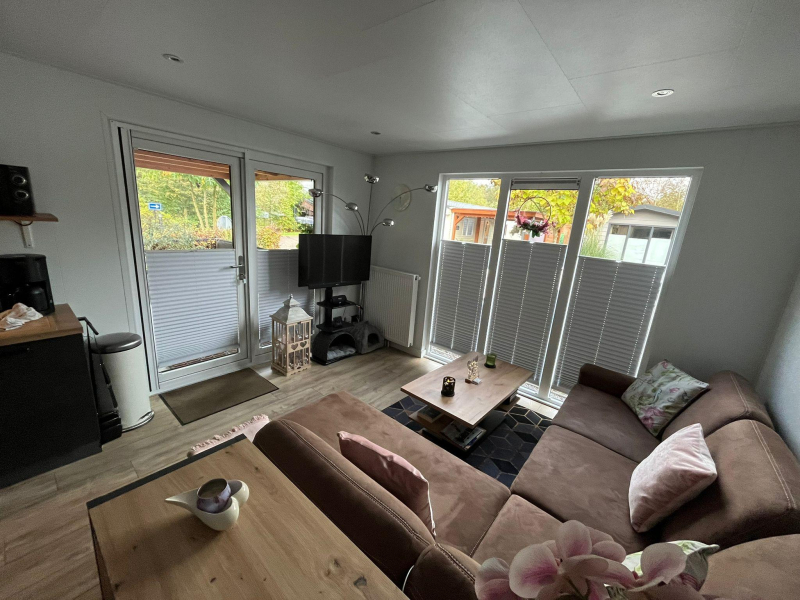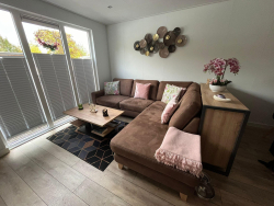 Deze luxe vakantiewoning is voorzien van een ruim woongedeelte, een moderne keuken, badkamer met inloopdouche en twee slaapkamers.