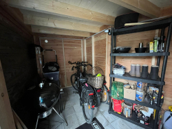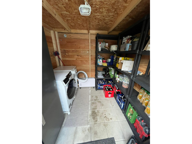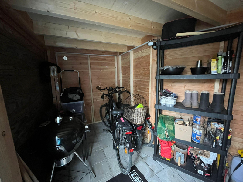 De ruime berging, verdeeld in 2 delen, is voorzien van elektra, water en afvoer.