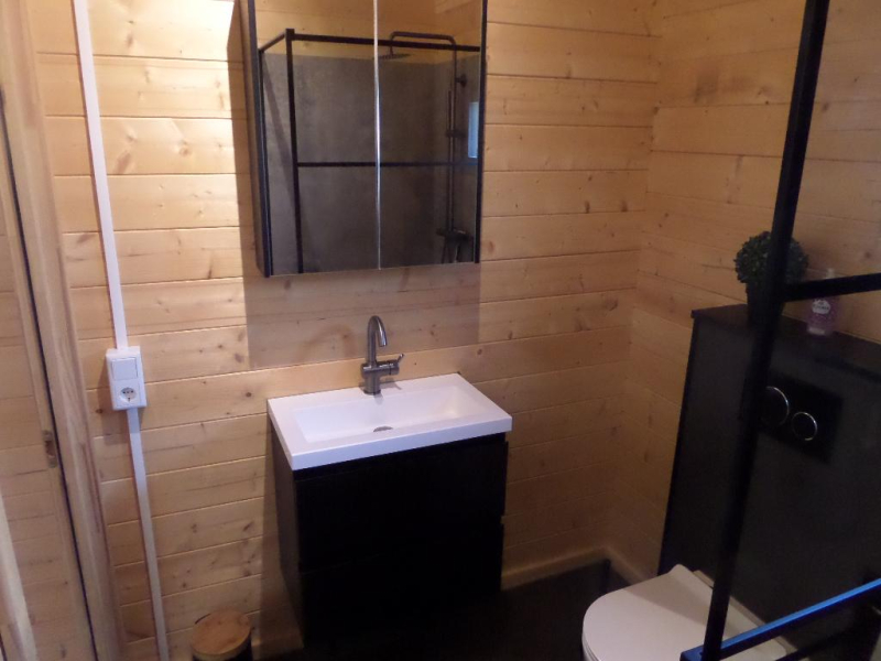 De ruwbouw is 68mm dik en is als eerste geplaatst, vervolgens zijn er profielen gemonteerd waarin de isolatie verwerkt is. Tenslotte is de blokhut volledig afgewerkt met Douglas potdekselplanken.